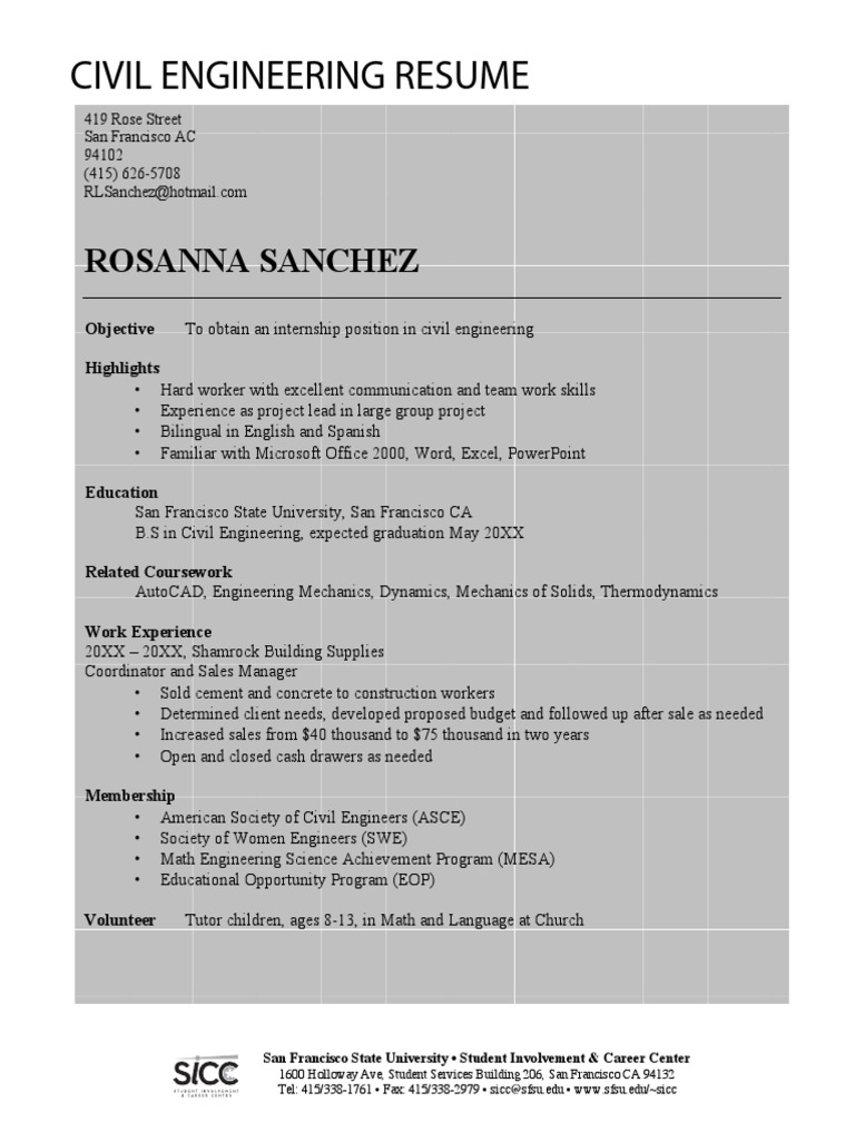 A proven job specific resume sample for landing your next job in 2020. Students trying for civil engineering job must have a strong resume that depicts internship experience, education, and certification in the said field. Professional summary civil engineering student seeking an internship in structural or geotechnical engineering. For each item you include, list the name of the employer, the city and state where you however, you can still put internships under professional experience. Internships here add value to your resume. To secure a civil engineering position at estate construction company. Civil engineers are responsible for a wide range of functionalities such as construction, maintenance, planning and designing of infrastructure and building facilities projects. Internship resume example ✓ complete guide ✓ create a perfect resume in 5 minutes using our resume examples & templates. Civil engineering role is responsible for interpersonal, leadership, organization, design, technical, autocad, training experience for civil engineering internship resume. A civil engineer with more than 5 a civil engineer with more than 5 yrs of vast experience in infrastructure like metro stations, road and railway tunnels, bridges and metro rail viaduct structures and high. Format your civil engineering resume correctly. Internship report on a well known developer company of bangladesh. If you are particularly interested in environmental engineering, there are options for you like ncaor any civil engineering companies will not notify for any internship in their websites or from any other source, best way is to get the contact details. What's the difference between a beautiful engineering project and disaster? Writing resumes can be a very tricky affair because your resume is basically an introduction to your employer. Find this pin and more on best resume example for your jobs by rebecca anderson. Below is a sample resume for a civil engineer. Backed by successful internship experience and knowledge of engineering theories, principles. 2,328 civil engineering internship jobs available on indeed.com. Sample civil engineering student resume. An ambitious and dedicated civil engineer with strong practical and technical skills and a range of experience within construction engineering and project management. Professional certifications and licenses can also be included under your. Complete a civil engineering internship. A civil engineer intern performs documentation and tracks documents for reports, verifies all the agreements for invoices and assists the civil engineer in reviewing complaints and resolving problems. Remember that the examples below are meant as guides only. The experience may include attachments, internships and actual employment in different organizations. Find the best summer internships in india for civil engineering students in 2020 with attractive stipends. Having a sound knowledge of designing, testing and evaluating a designs overall effectiveness, cost, reliability, and safety. Civil engineer internship jobs description. Apply to civil engineer, entry level civil engineer, utility worker and more! Make decisions within established guidelines and provide, under supervision.