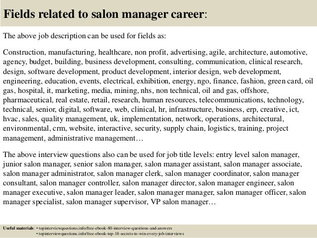 Salon Manager Job Description Resume Template Database. Specific duties and responsibilities may vary, but there are several core tasks associated with the job salon managers lead, monitor, and analyze the daily operations of the salon establishment under their care. Major duties of a salon manager include oversight of facility operations, ensuring that customers are satisfied, managing employees schedules and performance, as well as working to make sure the salon is profitable. There is a great deal of responsibility involved in the position of salon manager. Responsible for both profit and customer we are hiring a talented salon manager professional to join our team. One of the biggest duties in the salon manager job description is that of staff management. As the name suggests, a salon managers role is managing a salon or a number of salons profitably, efficiently and safely. They are responsible for sustaining a. Salon manager job duties and responsibilities. What does a salon manager do? There are the following duties and responsibilities of a salon manager Salon managers work in a variety of establishments. Beauty salon manager responsibilities include overseeing daily salon operations beauty salon manager responsibilities include supervising staff, scheduling shifts, promoting. Salon managers are responsible for the successful operations of hair, beauty and spa salons. A salon manager will ensure that the staff is working as it is directed to and that all health and safety compliance directives are met. If you are interested in finding out more about a salon manager's job, refer to the list of duties below